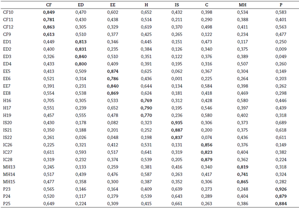 Bido e Silva (2019) depreendem que a confiabilidade do modelo é auferida por meio do peso de cada indicador, o qual deve apresentar peso superior a 0,7, conforme expressa a Tabela 2. Nesta pesquisa, constatou-se que a maior parte dos indicadores mencionados anteriormente apresentou peso maior que 0,7, exceto a CF9 que apresentou um indicador de 0,61.