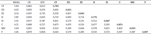 Segundo Hair et al. (2019), o primeiro passo antes de gerar o modelo estrutural para a MEE é a análise fatorial confirmatória, com o ajuste de modelo obtido pela validade estrutural convergente e descriminante. Considerando as cargas fatoriais dos indicadores, optou-se pela exclusão do indicador H18 por apresentar um nível de confiança inferior a 1,96, que é o mínimo recomendado por Hair et al. (2019). Na Tabela 2, faz-se a apresentação dos resultados da análise fatorial confirmatória dos dados.