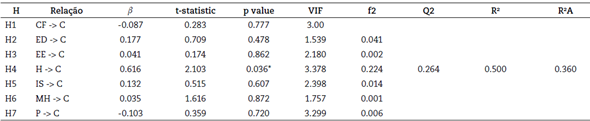 No que concerne à validade convergente, Hair et al. (2019) sustentam que esta é utilizada para identificar a correspondência de escala entre medidas, sendo recomendado que a AVE seja superior a 0,5. Os resultados obtidos demonstram que as variáveis latentes possuem escalas com consistência interna relevante, o que possibilita a análise estrutural. Após a verificação dos pressupostos, é apresentado na Tabela 4 o modelo estrutural.