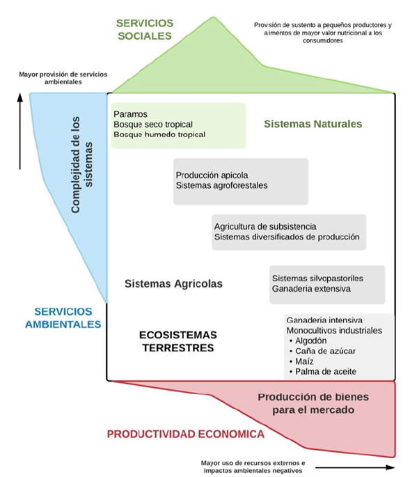 En la época geológica actual, el Antropoceno, los humanos son la fuerza primaria que define los ecosistemas de la Tierra. El hombre ha creado un amplio espectro de ecosistemas antropogénicos, o antromas, desde ciudades y sistemas altamente intervenidos de agricultura industrial hasta remanentes de ecosistemas naturales en los que los humanos actúan en autoridad legal como sus protectores (Rivera-Ferre et al., 2013). Hoy en día, en un esfuerzo por mitigar el impacto del ser humano sobre la Tierra, la sociedad demanda de la agricultura no solo la producción de bienes, sino la generación de servicios ecosistémicos y sociales. En este cambio de prioridades, los sistemas agrícolas dejaron de ser pensados como sistemas de producción con una única función a ser concebidos como sistemas multifuncionales en capacidad de promover la sostenibilidad económica, ambiental y social. En este contexto, los productores agrícolas no son agentes externos que explotan los sistemas agrícolas sino elementos de estos sistemas (Power, 2010; Rivera-Ferre et al., 2013). La figura 1 provee ejemplos de este espectro de intervención por parte del hombre y el potencial de proveer beneficios económicos, servicios ambientales y sociales relacionados con estos ecosistemas. En el Antropoceno, los sistemas agrícolas son considerados sistemas socioecológicos solo distinguibles de los ecosistemas naturales por el nivel de intervención, y ambos son considerados antromas de los ecosistemas terrestres.
