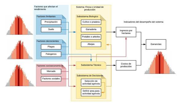 Una visión normativa1 y lógica de aplicación transdisciplinar que permite introducir la incertidumbre y el riesgo asociado a la implementación de acciones y capturar la complejidad de los problemas a diferentes escalas de los sistemas agrícolas es el Análisis de Decisiones (AD) (Anderson, 2003; Anderson et al., 1977; Bell et al., 1989; Luedeling & Shepherd, 2016). Un tomador de decisiones en el sector agrícola (desde un pequeño agricultor hasta un consultor científico o de políticas públicas al servicio del Ministerio de Agricultura) enfrenta situaciones del mundo en que los beneficios de la adopción de oferta tecnológica, apropiación de tácticas o estrategias de manejo, o intervenciones en el sistema productivo son inciertos. El AD también puede ser usado durante la fase de desarrollo de ofertas tecnológicas incrementando las oportunidades de su adopción. En este contexto, el AD permite estimar en escenarios dudosos cuáles son las opciones con mayores beneficios potenciales, o cuáles son las brechas de conocimiento que limitan la aplicación de una opción seleccionada (Anderson et al., 1977; Raiffa & Schlaifer, 1961). Cuando el AD es concebido desde la perspectiva de la Teoría de Sistemas, ofrece la posibilidad de conectar resultados de investigación experimental (campo o laboratorio) obtenidos en diferentes épocas o por diferentes grupos de investigación y extender esta visión global de conocimiento a aplicaciones potenciales en el contexto socioeconómico de los actuales sistemas productivos.