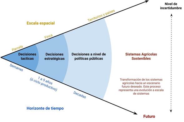 El cono de la incertidumbre permite representar adecuadamente la jerarquía de los problemas de decisión en el sector agrícola (figura 3). En esta representación, la incertidumbre aumenta en proporción a la escala espacio-temporal de los problemas de decisión. Este incremento en la incertidumbre está asociado a que entre más lejos ocurran los eventos en el futuro, más difícil es predecirlos, y entre más grande la escala de un territorio, mayor es la heterogeneidad del paisaje.