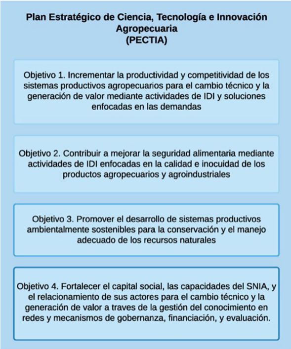 Corporación Colombiana de Investigación Agropecuaria (Corpoica), Departamento Administrativo de Ciencia, Tecnología e Innovación (Colciencias), & Ministerio de Agricultura y Desarrollo Rural (MADR). (2016). PECTIA. Plan Estratégico de Ciencia, Tecnología e Innovación Agropecuaria del Sector Agropecuario Colombiano (2017-2027). Corporación Colombiana de Investigación Agropecuaria, Departamento Administrativo de Ciencia, Tecnología e Innovación, y Ministerio de Agricultura y Desarrollo Rural. https://repository.agrosavia.co/handle/20.500.12324/12759