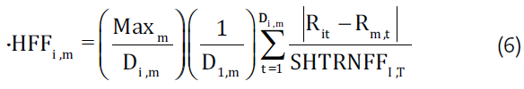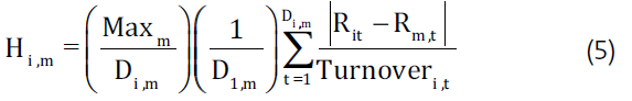 We use the logarithmic return of asset i on the d-day of month t (Ritd). The volume corresponds to the traded total of asset i on day d of month t (Vitd). As transaction days (Dit), we consider the number of days the share is traded within month t. The number of transaction days in a month i is denoted as (Maxit), as the number of shares traded in the period (NSTI,M,T), (NI,T) is the number of shares available (outstanding). The floating capital consists of the percentage of shares that can be traded in the financial market and that are not stably held by shareholders, in English it is known as the Free-Float, we denote it as (FFi,t).