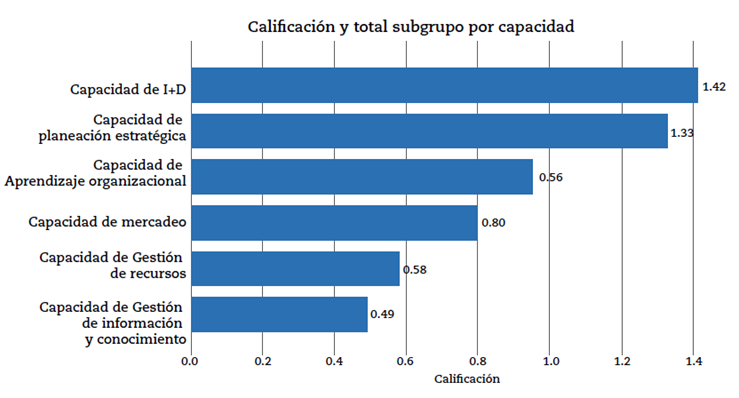 A partir de la información presentada, se evidencian fortalezas en la categoría “capacidades de I+D” en lo referente a cultura investigativa, lo cual coincide con el estado actual y el nivel de apropiación dentro del grupo. Por otra parte, en segundo lugar, la categoría “capacidad de planeación estratégica orientada a la innovación”; en tercer lugar, la categoría “capacidad de aprendizaje organizacional”, la cual presenta una evaluación media, en promedio una puntuación de 1 en el total del subgrupo y variables. Entre las siguientes categorías como “capacidad de mercadeo”, “capacidad de gestión de recursos” y “capacidad de gestión de información y conocimiento” obtuvieron, en promedio, una calificación menor a 1, lo cual puede llevar al planteamiento de mejoras.