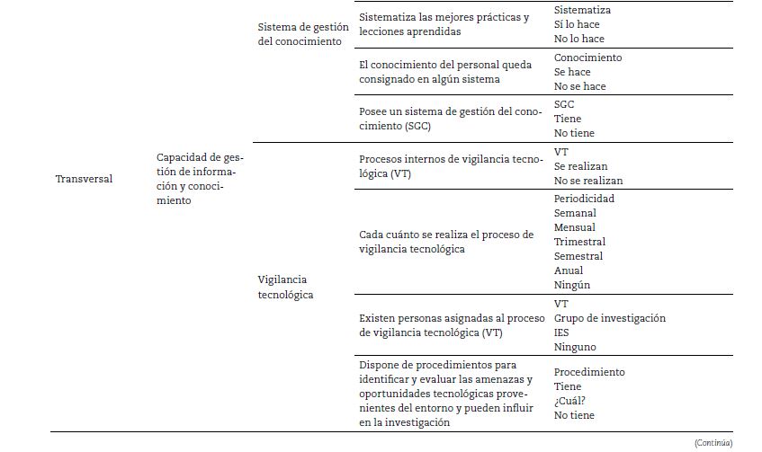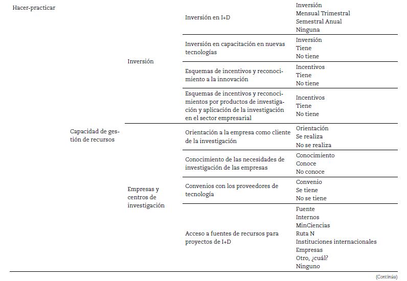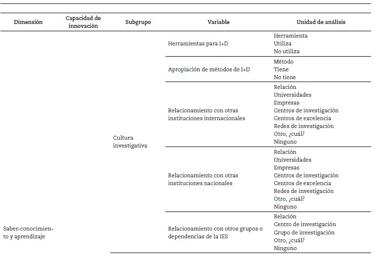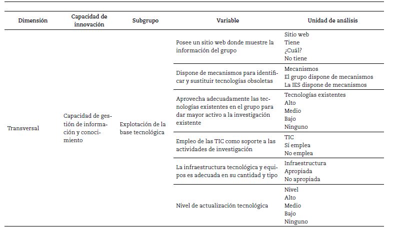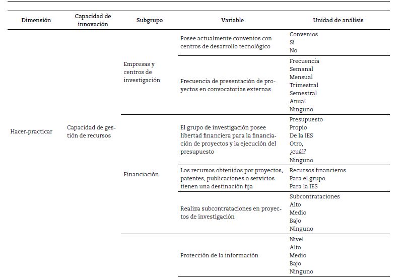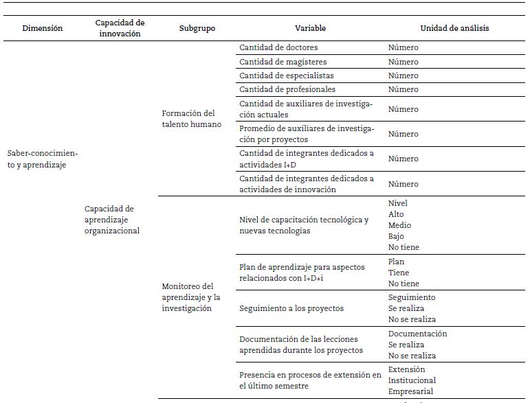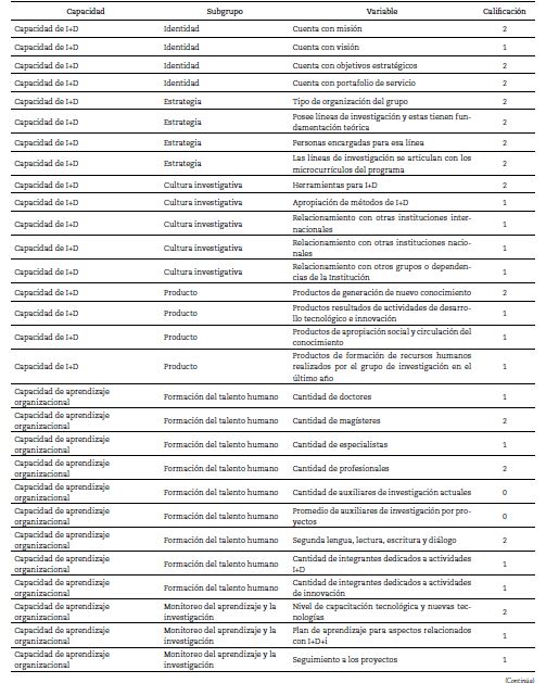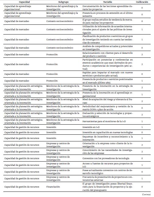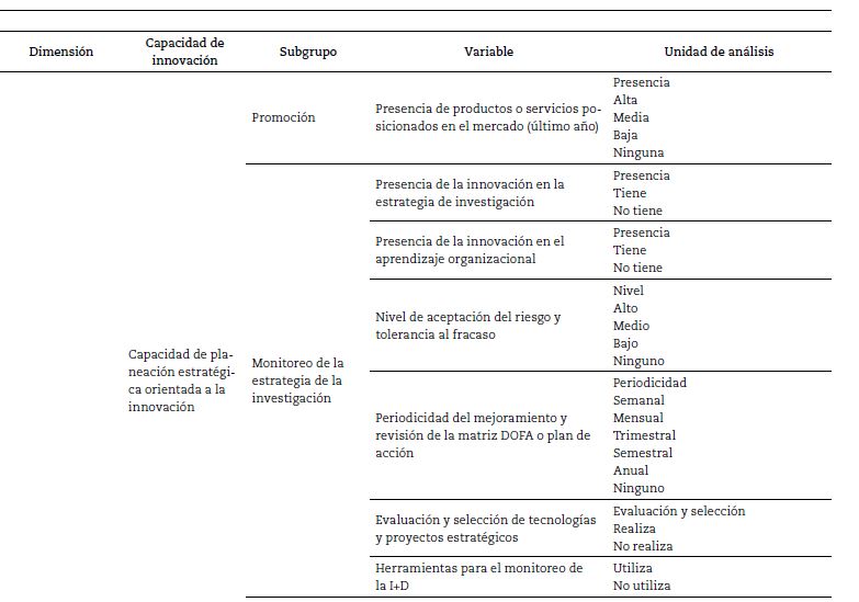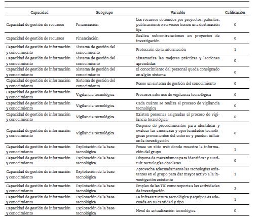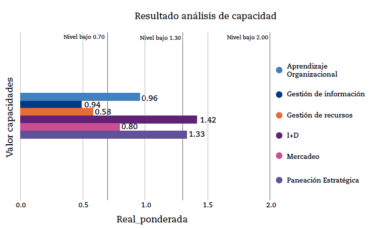 Las anteriores capacidades de innovación se definieron de acuerdo con la herramienta propuesta por Henao Moná (2013); estas se conservaron de la misma manera en que fueron planteadas. La calificación de las variables se hizo con la siguiente escala: 0, no adecuado; 1, medianamente adecuado; 2, adecuado. Además, los resultados de cada capacidad se evaluaron en los niveles: bajo, entre 0 y 0.7; medio entre 0.8 y 1.3; alto, entre 1.4 y 2.