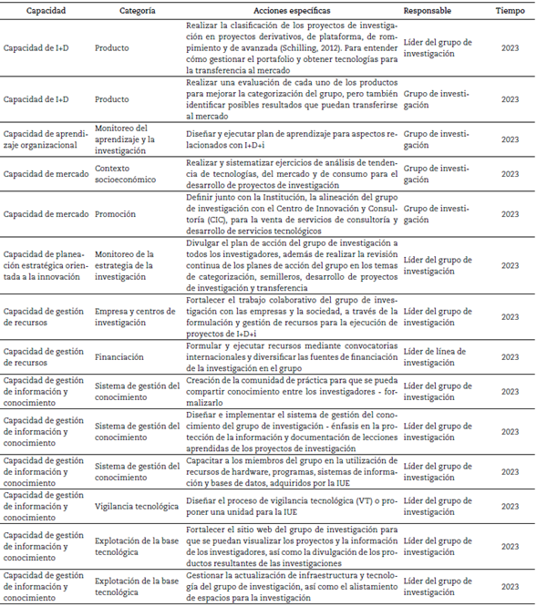 Conclusiones: el grupo tiene capacidades de innovación en nivel alto, lo cual permite que los cambios puedan realizarse de manera más rápida, considerando el plan de acción propuesto para el cierre de las brechas. Además, se requiere diversificar las fuentes de gestión de recursos externos para el desarrollo de investigación, desarrollo tecnológico e innovación.