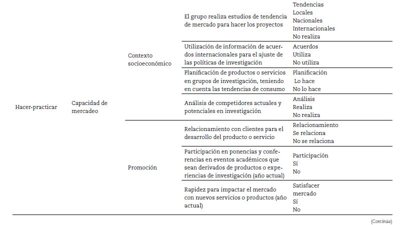 Romero Duque et al. (2018) evaluaron este tipo de capacidades de dos instituciones de educación superior. La Fundación Universitaria Los Libertadores, con base en la metodología de capacidades y recursos, propone una matriz de evaluación con el fin de ubicar puntos mediante el diagnóstico. Si bien este modelo no incluye específicamente a los grupos de investigación, sí es una buena herramienta que se puede utilizar, puesto se encuentra enfocada desde la parte educativa y no empresarial; por tanto, los indicadores pueden ser llevados a diferentes ámbitos educativos.