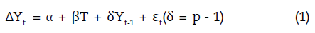 Where Y is the series in analysis, Δ is the difference operator, α is the constant, T is the trend, and ε the white noise. The constant or trend is included due to a previous average test, and the trend is observed graphically.