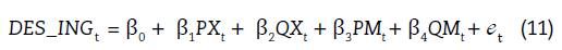 Of the series studied (see Appendix 1), economic growth, labour productivity, export volume, import price, and import volume are stationary at (integrated zero order, I(0)); the others needed a first difference to be stationary (integrated order one, I(1)). Cointegration (see Appendix 2) lies only between economic growth, labour productivity, vulnerable employment, poverty, and international trade (prices and volumes). The absence of cointegration between the variables prevents the regression between them via Ordinary Least Squares from being invalid (Johnston & DiNardo, 1963); therefore, models (10) and (11) are not interpretable.