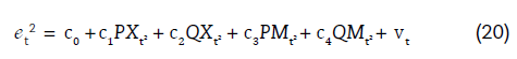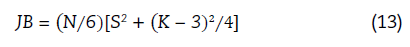 Where N is the number of observations, S is the coefficient of asymmetry, and K is the coefficient of courtesies. If this statistic exceeds the critical value (x22,5% = 5.99), H0 is rejected, indicating possible specification problems and preventing subsequent statistical tests from being invalid.