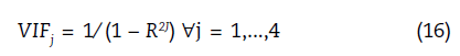 Where R2j is the coefficient of determination between the explanatory variable j and the remainder of the explanatory variables, a VIF above five (5) indicates that the variable under analysis highly correlates with the other explanatory variables.