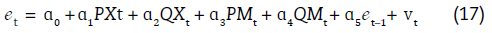 The goodness of adjustment (R2) percentages of the models associated with economic growth, labour productivity, and vulnerable employment are 77.70%, 43.96%, and 74.64%, respectively; the model associated with poverty is not interpretable due to the lack of individual statistical significance (see Appendix 3). There is, for the period 2000-2021, a long-term positive relationship between economic growth and export volume (β2 = 0.37) and import volume (β4 = 0.40), likewise between vulnerable employment and export volume (β2 = 0.27) and import volume (β4 = 0.20). In contrast, the labour productivity ratio to export volume is negative (β2 = -0.36). Regarding the prices of international trade, only the import price is significant, the relationship between this and economic growth (β3 = -0.43) and vulnerable employment (β3 = -0.37) being negative but positive with labour productivity (β3 = 0.37) (see Appendix 4 y 5).