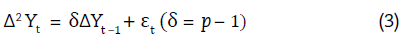 Where ESδ is the standard error of the δ parameter. If the DF statistic exceeds the critical value Tau by 5%, H0 is rejected.