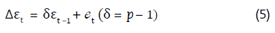 The waste series (ε) is subjected to the Dickey-Fuller unit root test with the specification (5):