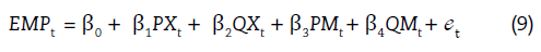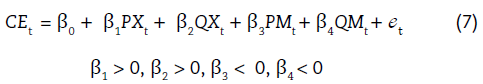 Where CE is economic growth, PRO_LAB is labour productivity, EMP is vulnerable employment, ESP is life expectancy, DES_ING is income inequality, POB is poverty, PX is export price, QX is export volume, PM is the import price, QM is the import volume, and t is the time (2000-2021). Table 1 summarises the operationalisation of the research variables.