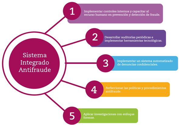 El riesgo de fraude incluye valorar la eficacia de los controles internos en las entidades, por supuesto incluidos los controles que relacionan la gestión del riesgo y posible fraude (Internation Audit Fundation, 2020). Para complementar con la propuesta registrada en la Figura 2, es importante que las corporativas y las instituciones públicas consideren los elementos aquí descritos como apoyo a los procesos de prevención del fraude, delito y corrupción. Para ello, en la Figura 3, el autor enfatiza, entre otros elementos, que se trabaje con el recurso humano en perfeccionar el conocimiento para detectar y prevenir posibles fraudes; en ese contexto, no puede faltar un sistema tecnológico integrado como herramienta de apoyo para garantizar el control interno, como se infiere.