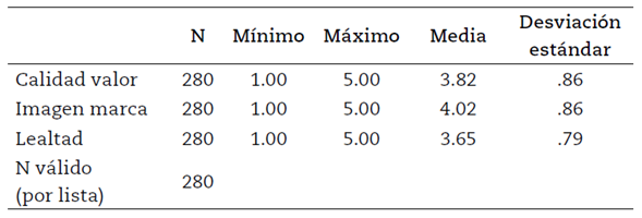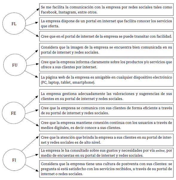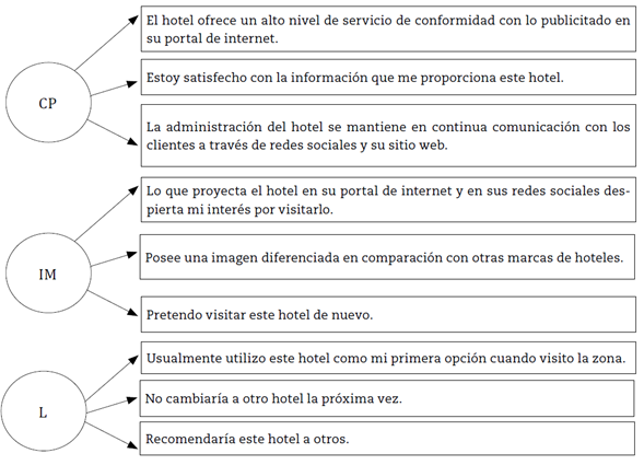 Metodología: Se llevó a cabo un estudio cuantitativo, no experimental, transversal, descriptivo y correlacional. Los participantes fueron 280 seguidores de la página de Facebook de la empresa. Se utilizó un cuestionario con 21 ítems, empleando análisis factorial confirmatorio con el método de máxima verosimilitud para determinar la validez de constructo y el coeficiente alfa de Cronbach para la fiabilidad.