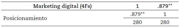 Se observa una relación positiva considerable entre el marketing digital (4Fs) en la empresa y su posicionamiento (.879**), con un nivel de significación positiva alta de .01, lo que denota que a un mayor marketing digital mayor posicionamiento de marca.