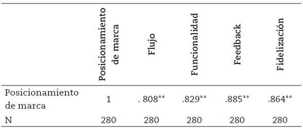 Resultados: El análisis de correlación de Pearson mostró una relación significativa alta entre las 4Fs del marketing digital y el posicionamiento de marca: flujo (0.808), funcionalidad (0.829), feedback (0.885) y fidelización (0.864). Todas las correlaciones son significativas al nivel 0.01 (bilateral).