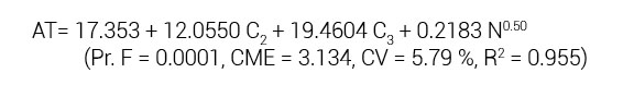 donde: AT = altura de planta (cm), N = dosis de N (kg N ha-1), C2 y C3 = son variables auxiliares para las cosechas 2 y 3, respectivamente, con respecto a la cosecha 1.