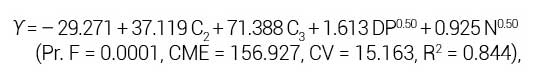 donde: ϒ = rendimiento de follaje de verdolaga en fresco (t ha-1), DP = densidad de plantas (plantas m-2), N = dosis de N (kg N ha-1), C2 y C3 = son variables auxiliares para las cosechas 2 y 3, respectivamente, con respecto a la cosecha 1.