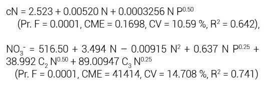 donde: cN = concentración de N (%) en materia seca, NO3- = concentración de NO3- en follaje de verdolaga (mg NO3- kg-1 de materia fresca), N = dosis de N (kg N ha-1), P = dosis de P (kg P2O5 ha-1). C2 y C3 = son variables auxiliares para la cosecha 2 y 3, respectivamente, con respecto a la cosecha 1.
