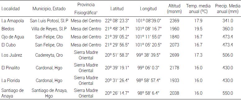 Se estudiaron ocho poblaciones de Pinus cembroides de la región central de México (Cuadro 1). Se recolectaron hojas jóvenes de 20 árboles seleccionados al azar en cada población, dejando una distancia de por lo menos 30 m entre ellos para evitar recolectar material de árboles emparentados. Se tomaron muestras de 10 g de hoja de cada uno de los individuos, éstas se depositaron en bolsas plásticas con cierre hermético y se mantuvieron sobre una capa de hielo hasta depositarlas en un ultracongelador (Thermo Scientific ULT2586, Waltham, Massachusetts, U.S.A.) a -80 ºC durante una semana.