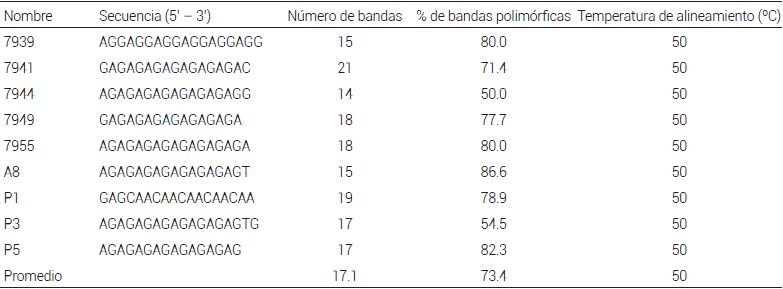 Los nueve iniciadores que se utilizaron generaron un total de 154 bandas, dando como resultado un promedio de 17 bandas por iniciador. El número de bandas que se generó por iniciador fue variable, desde 14 con el iniciador 7944, hasta 21 con el iniciador 7941. El polimorfismo detectado por iniciador varió de 50 a 86.6 %, donde el iniciador A8 fue el que mostró un mayor porcentaje de loci polimórficos (Cuadro 2).
