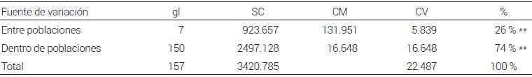 El coeficiente de diferenciación genética entre poblaciones (GST) se calculó con base en Nei (1975). Este estimador es altamente dependiente de la cantidad de variación que hay dentro de las poblaciones y del total de la población.