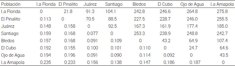 Los valores de distancia genética de Nei que se encontraron entre las poblaciones de las dos regiones variaron de 0.075 a 0.206 (Cuadro 5). Las poblaciones más alejadas genéticamente fueron las de La Florida y La Amapola, lo que coincidió con que son las poblaciones geográficamente más lejanas; sin embargo, este patrón no se presentó para todas las poblaciones; por ejemplo, las de Santiago de Anaya y Los Juárez fueron las poblaciones más cercanas genéticamente, pero no son las poblaciones geográficamente más cercanas.