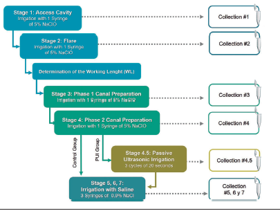 Materials, instruments, and devices. A size 10 K-file (Dentsply Maillefer, Ballaigues, Switzerland) was introduced and the length was recorded when the tip of the file was visible at the apical foramen. The working length was determined by subtracting 1 mm from this length. The apices of the specimens were sealed with wax to prevent the overflow of irrigating solutions. Canals were instrumented using manual K-file instruments (Dentsply Maillefer) up to master apical file (MAF) size 35 in a crown-down technique applying the following irrigation protocol: from the access cavity to finished instrumentation, the teeth were irrigated with 5% NaOCl (12 mL in total) using a Monoject Irrigation Syringe (size 27-gauge needle) between each instrument change, for a total of 4 stages recollection. The needle was placed at 1 mm from the working length with a backward and forward movement. After that, the control group was irrigated with 9 mL of saline (corresponding to stage 5, 6, and 7). The clinical irrigation protocol described above was also applied to the teeth of the experimental group, but the activation step was added after the mechanical preparation of the canal and before saline irrigation. The root canal was filled with NaOCl to the height of the access cavity and then activated by PUI in 3 cycles of 20 seconds each. Activation was carried out with NSK® Ultrasonic Scaler Various 560, in “E” mode (EndoMode), at medium power, and standardizing for samples with a # 20 file and at -1 mm from the working length. Non-refreshment of hypochlorite was incorporated between cycles. The collection of the 3 volumes (one per cycle) was carried out using a micropipette and this stage was called 4.5 (E4.5). The solutions of each root canal were collected during the different phases of the treatment using an intracanal aspiration device specially designed for this study. The 7 samples from the control group and the 8 samples from the experimental group were transferred to Eppendorf tubes (1.5 mL) and centrifuged at 10,000 rpm for 5 minutes at 4 °C, to remove residues and then we proceeded to chemical analysis. Figure 1 shows the flowchart of the stages of endodontic treatment according to the clinical irrigation protocol, with the respective collections and the indicated protocols.