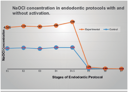 In Figure 2, the linear representation of the concentration of sodium hypochlorite obtained in the stages of the endodontic protocols is shown. It is observed that the graph of the activated irrigant reaches higher concentrations of NaOCl in a greater number of stages, for the protocol without activation, highlighting stage 5.