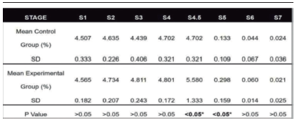 Using the spectrophotometric method, the concentration of sodium hypochlorite was measured in the volumes collected in stages E1 to E4, which included the stages from the access cavity to the step back which is collection No. 4. Also, the residual NaOCl concentration after washing the root canal with the intermediate irrigant (E5 to E7) was determined. Concentrations during the activation corresponding to step E4.5 were also measured. The results obtained are shown in Table 1. In the first 4 stages, there were not concentration differences between groups. In stage 4.5 (PUI activation) there was a significant difference between treated and control groups (p <0.05). At saline irrigation stages, there were only significant differences in E5 between the groups. In both groups, it was possible to quantify NaOCl in small concentrations. For the other stages, there was no statistical difference between the two groups.