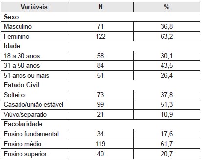 Do total de 193 prontuários, 63,2% dos indivíduos eram do sexo feminino com idade entre 18 e 81 anos, média de 40,8 e desvio padrão (dp) de 14,6. Em relação ao estado civil, a maioria era casado ou mantinha união estável e 61,7% já cursou o Ensino Médio. Os dados sociodemográficos estão descritos na Tabela 1.