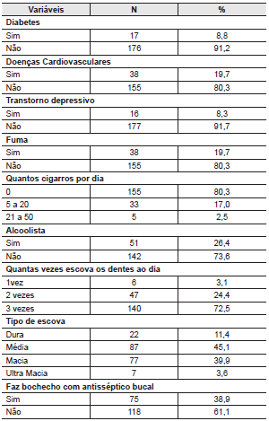 Primeiramente, foi avaliada a ficha de anamnese onde constam os dados sociodemográficos como: sexo, idade, estado civil, escolaridade, doenças crônicas auto reportadas pelo paciente (diabetes, doença cardiovascular e transtorno depressivo), fumo e alcoolismo. Dados sobre frequência de higiene bucal, tipo de escova dental uso de antisséptico também foram retirados da ficha anamnese.