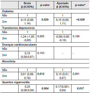 O modelo de regressão testou a variável PS, hábitos nocivos e doenças crônicas. Após ajustes no modelo de regressão múltiplo observou-se que diabetes (β=0,15; IC95%0,06-1,11) e quantidade de cigarros fumados (β=-0,17; IC95% (0,001-0,04) tiveram influência na PS, explicando essa influência em 15% e 17%, respectivamente. As variáveis estiveram associadas no modelo bruto (p<0,10), mas após o ajuste perderam a associação: transtornos depressivos e alcoolistas e as variáveis que se mantiveram associadas com p<0,05 foram somente quantidade de cigarros e ter diabetes (Tabela 4).