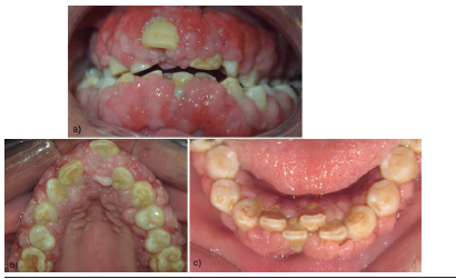 Paciente género masculino, 27 años, acude al Postítulo de Periodoncia de la Facultad de Odontología de la Universidad de Chile. Antecedentes mórbidos: monorreno congénito, anomalía en la cual el paciente solo tiene un riñón desde el nacimiento. No existían antecedentes familiares pre existentes de esta condición. No conservó una buena función renal y evolucionó a una insuficiencia renal crónica, con diálisis por 4 años (2006 - 2010), siendo sometido a trasplante renal en 2010, quedando con terapia inmunosupresora de Cs 25 mg. cada 12 horas (consumo por al menos 6 años). Hipertensión arterial controlada con nifedipino 20 mg. cada 12 horas y diltiazem 60 mg. 1 vez al día. Desarrolló diabetes mellitus post trasplante renal (2014), controlada con metformina 850 mg. cada 8 horas. Hemoglobina glicosilada de 6.5%, valor entregado durante el periodo de anamnesis, cuando se le solicitó traer sus exámenes complementarios. Paciente en controles médicos regulares con nefrólogo, quien solicitaba periódicamente creatininemia, nitrógeno ureico y orina completa, entre otros exámenes, para controlar función renal y control metabólico. Sin tratamiento periodontal previo. Al examen clínico intraoral (Figura 1) se observa AG de 6 años de evolución, maxilar y mandibular generalizado, indoloro, fibrótico en las zonas posteriores y palatinas y friable en el sextante 2 y 5, en donde el AG cubre más del 75% de la corona clínica. Presenta migración dentaria patológica del diente 1.1 hacia vestibular, cálculo dental generalizado supragingival y subgingival, sangrado al sondaje >90% y pseudosacos periodontales. Los AG tienen base peduncu-lada en sextante 2 y 5 y a la presión digital presentaban supuración. Se solicitó radiografía panorámica. Índice de Placa de 100%. El paciente fue informado del tratamiento al que sería sometido y firmó el consentimiento informado relacionado con el tratamiento y con el reporte de su caso. El plan de tratamiento se detalla a continuación: