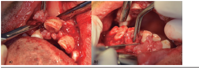 Fase quirúrgica etapa 2: Cuatro semanas posterior al último pulido radicular, se realizó gingivoplastía bajo anestesia infiltrativa al 2% con fresas diamantadas de alta velocidad. Se observó una recidiva del AG en la papila dental entre diente 1.3 y 1.2 (Figura 4a). Se repite el tratamiento con pulido y alisado radicular.