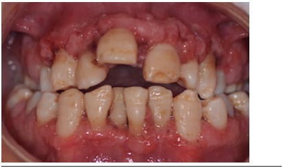 Fase quirúrgica: Esta fase también se abordó en dos etapas. Fase quirúrgica etapa 1: Dos semanas posteriores al destartraje realizado en la fase higiénica etapa 1, se realizó gingivectomía maxilar y mandibular (Figura 2). Técnica anestésica infiltrativa al 2%, se midió con sonda periodontal Carolina del Norte los pseudosacos periodontales y se hizo el marcaje externo. Se realizó incisión discontinua en dirección coronal en un ángulo de 45° con bisturí #15c, bisel interno, y se creó un contorno marginal festoneado. Se retiró los excesos de tejido gingival vestibular e interproximal con tijera quirúrgica, pinzas y curetas Gracey. Finalmente se colocó una gasa con suero fisiológico en los tejidos para realizar hemostasia, con presión por 5 minutos. Se indicó clorhexidina 0,12% por dos semanas y paracetamol 1 gramo cada 8 horas (no nefrotóxicos) en caso de malestar postoperatorio. Se controló la presión arterial y saturación de oxígeno por parte de un técnico en enfermería durante el procedimiento quirúrgico. Se realizó un control post quirúrgico a los dos días, observándose un cambio de la arquitectura y disminución de la inflamación gingival (Figura 3).