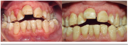 Fase de Terapia de Soporte Periodontal: Luego de la eliminación de la infección periodontal inicial del paciente mediante la fase higiénica y quirúrgica en las cuales se logró un aceptable control de biofilm dental (Índice de Placa <30%) y la eliminación de los AG, se consideró mantener al paciente en Terapia de Soporte Periodontal, con controles periódicos cada 3 meses para mantener el estado de salud gingival logrado hasta el momento (sangrado al sondaje <15%). En esta etapa se observó una reducción de la vestibularización del diente 1.1 (Figura 4b). El paciente no tuvo sensibilidad dental posterior a todo el tratamiento realizado.