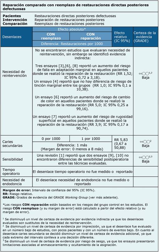 ● La reparación en comparación al reemplazo podría aumentar el riesgo de necesidad de reintervención en restauraciones directas posteriores defectuosas (certeza de la evidencia baja).