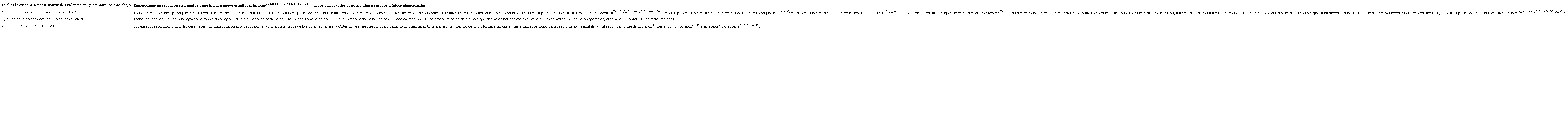 ● El desenlace caries secundaria, fue incluido en la tabla de resumen de resultados debido a que el desarrollo y progresión de la lesión de caries bajo la restauración puede generar un efecto secundario no deseado tanto para el paciente como para el clínico. Esto produce un debilitamiento de la estructura dentaria, lo que puede conducir incluso a un tratamiento más invasivo.