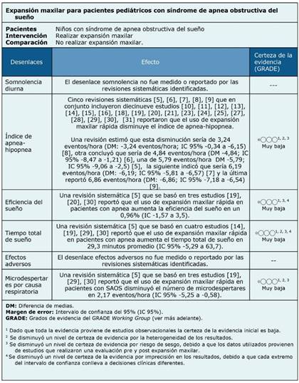 ● No es posible establecer con claridad si la expansión maxilar en niños con síndrome de apnea obstructiva del sueño disminuye el índice de apnea-hipoapnea y los microdespertares por causa respiratoria, debido a que la certeza de la evidencia existente ha sido evaluada como muy baja.
