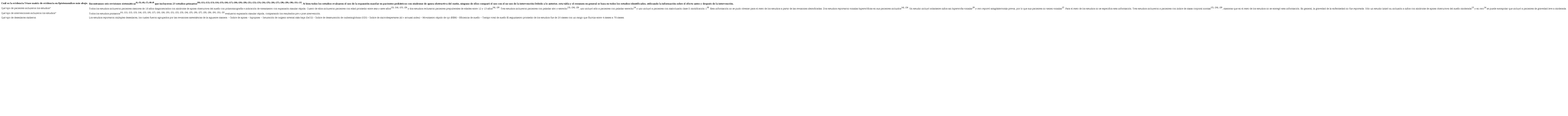 ● Otros desenlaces críticos como somnolencia diurna o efectos adversos de la intervención no fueron reportados por ninguna revisión sistemática.