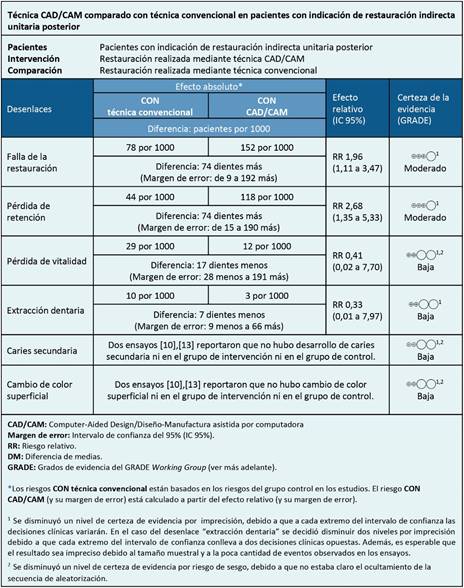 Resultados y conclusiones: Identificamos tres revisiones sistemáticas que en conjunto incluyeron ocho estudios primarios, de los cuales, cinco corresponden a ensayos aleatorizados. Concluimos que la técnica CAD/CAM probablemente aumenta la falla de la restauración y la pérdida de retención. Por otra parte, podría disminuir levemente la pérdida de vitalidad y tener nula o poca diferencia en el riesgo de extracción dentaria, riesgo de caries secundaria y cambio de color superficial, pero la certeza de la evidencia es baja.