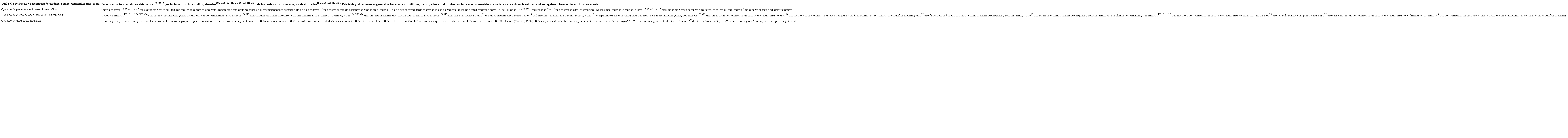 ● Ninguna de las revisiones identificadas realizó un análisis de costos entre las técnicas convencionales y CAD/CAM.