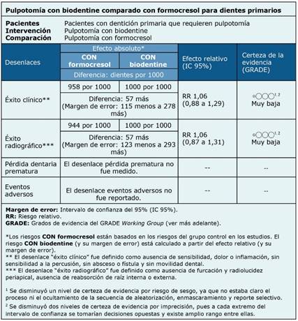 La información sobre los efectos de realizar pulpotomía con biodentine comparado con formocresol en pacientes con dentición primaria está basada en dos ensayos aleatorizados que incluyeron 142 dientes primarios con caries extensas.