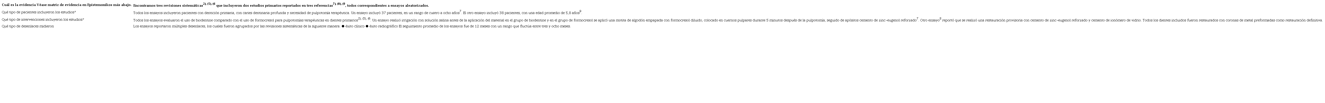 Todos los ensayos midieron éxito clínico y éxito radiográfico (142 dientes en 75 pacientes)7,9. Ninguna de las revisiones sistemáticas reportó los desenlaces pérdida prematura del diente y eventos adversos.