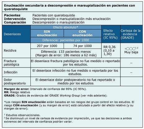 La información sobre los efectos de enucleación secundaria a descompresión o marsupialización en pacientes con queratoquiste está basada en 5 estudios observacionales que incluyeron 78 pacientes.